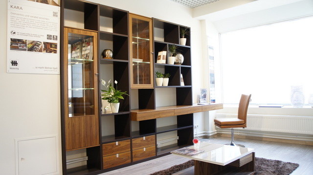 Библиотека с рабочим местом Kara (Германия, Musterring). 2 варианта: угловая комбинация и прямая. Материал: натуральный шпон ореха и лак (на водной основе) графит. Столешница с выдвижными ящиками. Толщина столешницы - 15 см, что дает возможность комфортно расположиться за столом. Комбинирование открытых полок и стеклянных дверок с внутренней подсветкой.